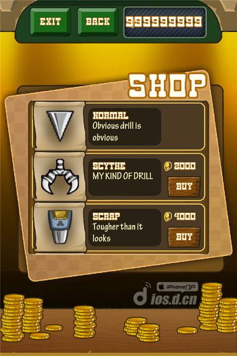 这款游戏拥有精美的画面和简单的玩法。玩家要控制掘地机向尽可能深的地方挖掘并搜集金子。途中将有各种各样的危险等待着玩家,隧道也将产生丰富的变化。游戏中还有大量的升级项目可供玩家用采集到的金子购买,包括大量的掘地机升级和各种各样的道具等。游戏中包含了大量的钻头可选,当然你需要通过你钻到的金币来换取,通过社交网络来和朋友们一较高下也是不粗的选择。