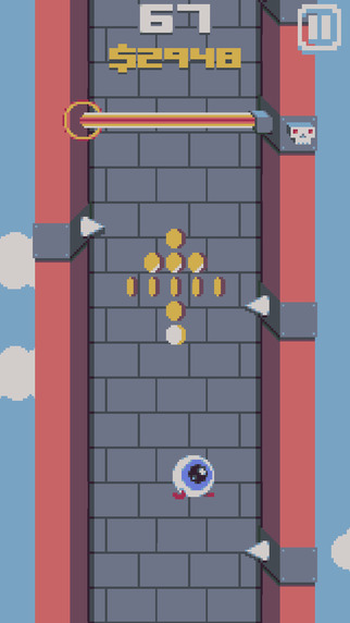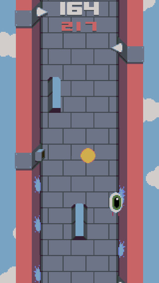 游戏玩法很简单,玩家要控制一只造型为眼球的谜之生物,在这座充满各种陷阱的高塔内不短往上爬升。通过点击屏幕,小眼球就会紧贴着塔内的墙壁,这时只要再点击一次屏幕,小眼球就会跳到对面的墙壁,反复操作便能往上攀爬了。