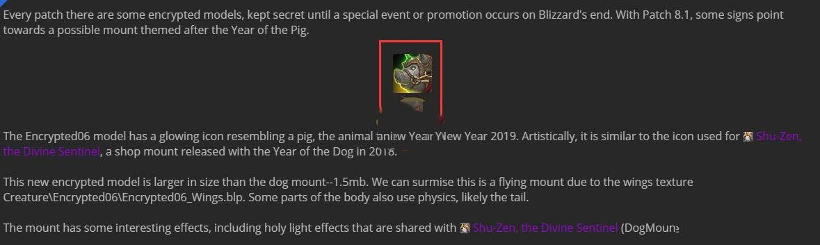 wow head 提前解析了8.1客户端,并且在游戏中发现 猪年坐骑的图标,从客户端解析来看,应该比去年狗年的坐骑体积更大,而且在客户端中“WING”分析来看,这是一只飞行坐骑,类似于飞天狐狸坐骑,上天就会展开翅膀