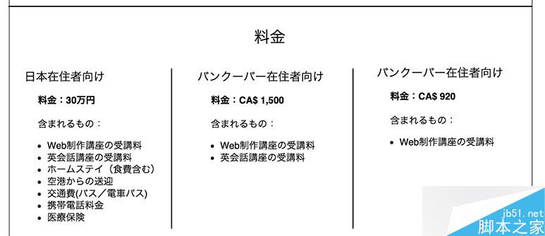 这里举个实际例子。我去参加一个在海外以成为创意家为目标的Frog School,定期举办短期网页设计和锻炼英语能力的讲座。这里有3个费用的计划,最初是像这样上面包含着这服务和费用汇总之后的文本。