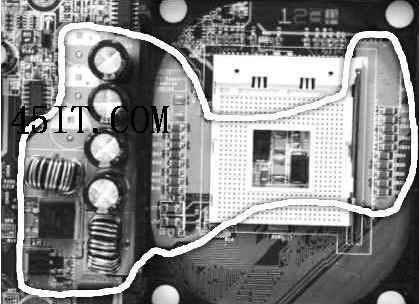 最后还有一点,很多人看到有些厂商在主板上电源电路标出的电容部分并没有安装电容(图4中可以看到),会认为是偷工减料,其实这可不一定是完全正确的想法。芯片组厂商在提供推荐电路的时候确实在相应位置设计了电容,但是以华硕而言,研发工程师可以选择最佳的元件,并依据多年研发经验来改善电路设计,以达到最佳性能。此时,原有的过多元件就不再需要了,而且去掉这些元件还可以在一定程度上增加空气流通能力,产生更好的散热效果,所以就留下了空位。